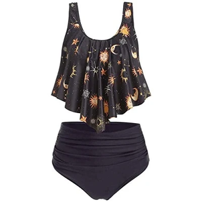 JMSUN Women Sun Stars Moon Flounce High Waisted Tankini Swimsuit, Black, Small