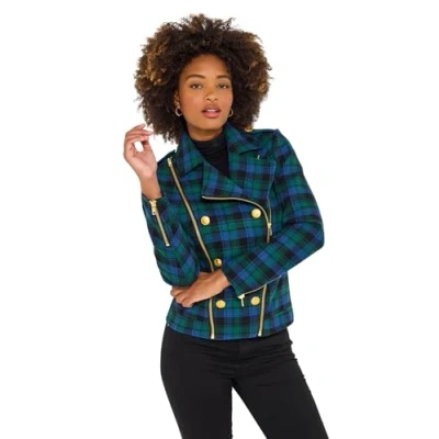 Unique biker jacket Simple zip fastening Classic check pattern Decorative gold buttons