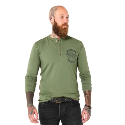 Khaki henley top Four metal buttons for fastening the neck Long sleeves Edgy chest print Contrast top stitch and back neck tape