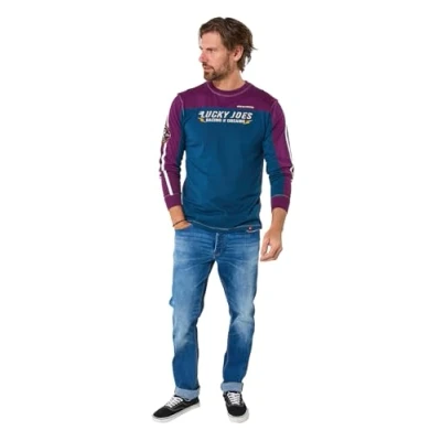 Soft jersey top with side splits Classic crew neck Long sleeves with ribbed cuffs Contrast panels and Lucky Joes graphic Badge and contrast stripe on the sleeve