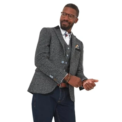 Make an entrance that turns heads at this year's Christmas party with our cross check blazer. The sleek shades of black and grey instantly grab attention, while hints of mustard add a delightful pop of personality. Search code "JA671A" to elevate your style further by pairing it with the matching waistcoat for an extra suave touch. A classic suit blazer, Suave cross check design, Subtle hints of mustard, Contrast lining can be used as a pocket square, Matching items available. Approx Length: 73cm