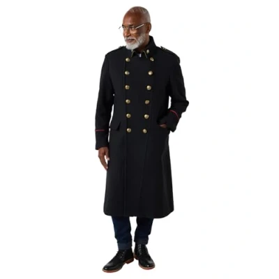 Longline military coat Contrast printed lining Metal military-style buttons and handy pockets Classic black colour with red piping Classic epaulettes and buttoned cuffs