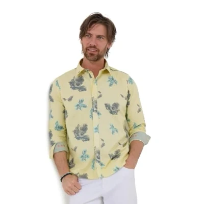 A fresh summer staple, this long-sleeve shirt combines a vibrant yellow base with a delicate floral print for an eye-catching yet easy-to-wear look. Thoughtful details like embroidered stars inside the cuffs and contrast trims add a unique touch to this effortlessly stylish design. The lightweight, breathable fabric makes it ideal for evening strolls, beachside bars, or any occasion where you want to stand out with confidence. Yellow shirt, Long sleeves, Floral print, Embroidered stars inside the cuffs, Contrast trims and tape