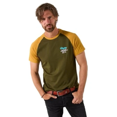 Mustard and khaki tee Classic crew neck Short raglan sleeves Music-inspired print on the chest and back Subtle embroidered detail