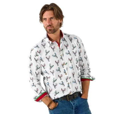 White shirt Long sleeves Novelty stag and bauble print Contrast trim and tape Classic collar design