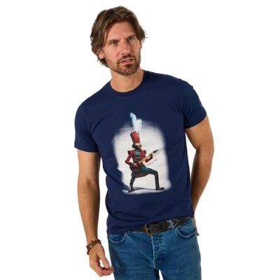 Navy tee in soft jersey fabric Classic crew neckline Short sleeves Novelty nutcracker guitarist graphic Contrast chain stitch and back neck tape