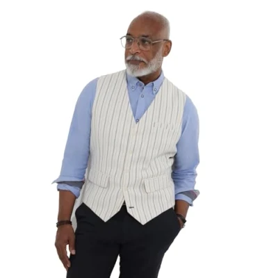Tailored linen blend waistcoat with classic cream and blue stripes for a dapper seasonal style. Designed with a cotton-lined back, tonal buttons, and pocket detailing for a sophisticated finish. A perfect match for the coordinating blazer—just add chinos or trousers for effortless elegance. Linen blend single-breasted waistcoat, Cotton lining on the back, Tonal buttons, Slick cream and blue stripes, Pocket detailing