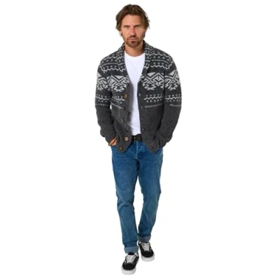 Thick knitted cardigan Cosy shawl neck Long sleeves Standout Fair Isle design Versatile grey colour