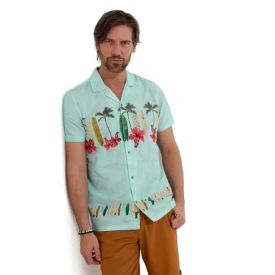 Capture the spirit of summer with this laid-back short-sleeve shirt, featuring an eye-catching surfboard and palm tree print. Made from a lightweight, textured fabric, it’s designed to keep you feeling cool and stylish in warm weather. Finished with a revere collar, contrast back neck trim, and classic tortoiseshell buttons, it’s the ultimate shirt for relaxed beachside days. Textured lightweight shirt, Short sleeves, Surfboard and palm tree print, Contrast trim to the back neck, Revere collar