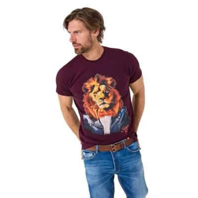 Maroon tee Classic crew neck Short sleeves Unique lion graphic Printed yoke