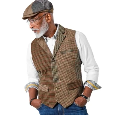 Amazon Waistcoat containing wool Contrast jacquard lining Handy pockets and mixed buttons for fastening Mixed checks with pops of red and green Smart collar design