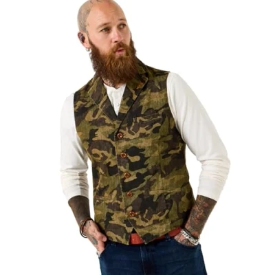 Waistcoat in washed camo fabric Contrast striped lining Handy chest pockets and standout buttons Cross stitch detail on the lapel Classic collar and back belt detail