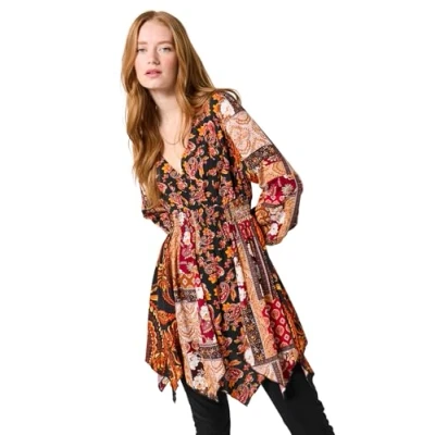 Woven fabric tunic dress Mock wrap-over neckline Long set-in balloon sleeves with elasticated cuffs Autumnal printed panels Playful handkerchief hem