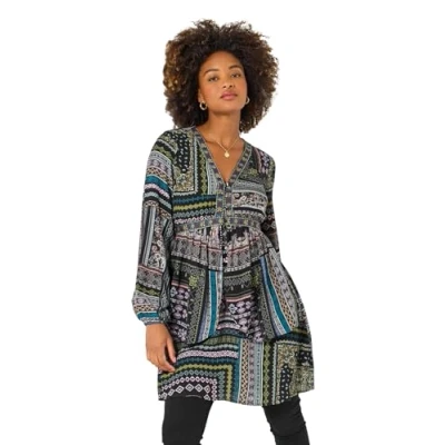 Woven fabric tunic dress Flattering V neckline with a jacquard trim Long balloon sleeves with elasticated cuffs Black base with a striking print Simple button fastening