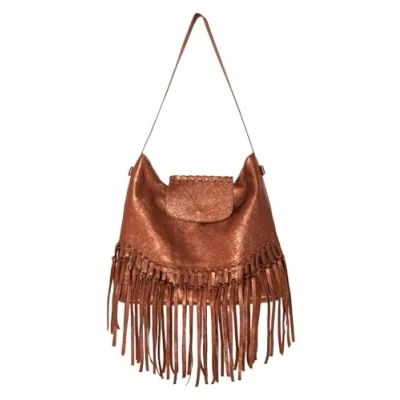 Boho Chic: Shimmering metallic bronze leather with a tassel detail for a free-spirited vibe. Versatile Straps: Includes a comfortable shoulder strap and a removable longer strap. Functional Design: Features a simple zip and Magdot closure with a handy inner zip compartment. *Boho leather tassel bag *Beautiful bronze colourway *Shimmering metallic finish *Comfortable shoulder strap *Removable long strap *Simple zip and magdot closure *Handy inner zip compartment Product Dimensions: 32cm x 33.5cm x11cm Strap Length: 119.5cm