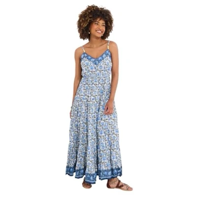 Breezy & Beautiful: A lightweight crinkle cotton sundress with a flattering V-neckline. Effortless Summer Style: Adjustable cami straps, a tiered skirt, and a contrast floral border. Perfect for Any Occasion: Whether it's a beach day or a summer wedding, this dress is a must-have. Crinkle cotton sundress, Flattering V neck, Adjustable cami straps, Maxi length, Blue floral print with contrast border