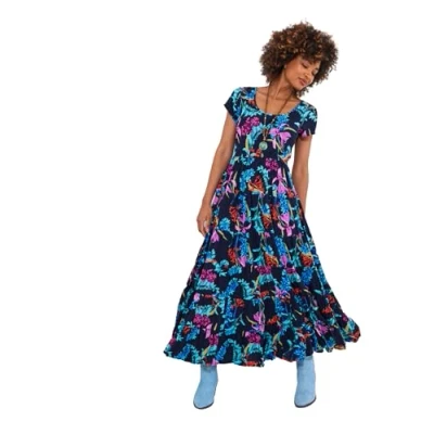 Joe Browns Women's Dark Floral Print Full Skirt Crinkle Maxi Dress, Navy, 8