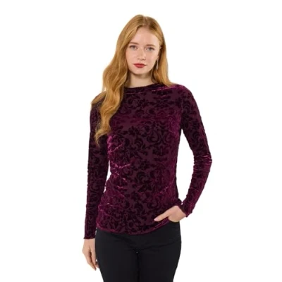 Stretchy devore top Cosy funnel neck Long set-in sleeves Berry colour with a floral design Baby overlock stitching at the neck, cuffs and hem