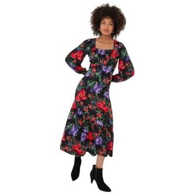 Feminine Touch: Full sleeves with tight cuffs add a feminine feel to this midi dress, complementing the gathered bust and bold floral print. Playful Design: Pretty and playful, this dress is an easy-wearing statement piece that will become your go-to look for winter. Eco-Conscious Fabric: Crafted with LENZING ECOVERO viscose fibres, it combines style with sustainability, making it a responsible fashion choice. Midi dress, Stunning floral print, Versatile black colourway, Pops of red and purple, Pretty gathered bust, Long sleeves, Tight cuffs, Made from jersey fabric. Approx Length: 120cm