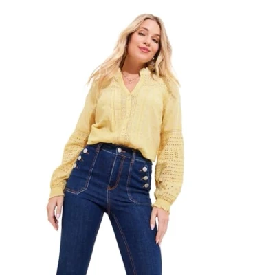 Shine bright in this joyful broderie blouse! Its stunning yellow color and vintage-inspired shape bring a feminine flair to your wardrobe, perfect for sunny summer days. Beautifully versatile, it pairs effortlessly with skirts, jeans, or shorts, adding a radiant pop of color to your outfits. Crafted for comfort and style, it’s lightweight and breathable, ensuring you’ll feel fabulous whether you’re heading out or relaxing in the sun. Bold blouse , Long sleeves with button cuffs , Intricate broderie detail , Pretty pleats. Approximate Length: 65cm