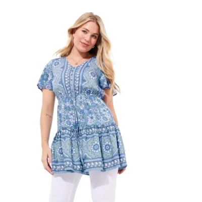 Put a boho spin on summer with this V-neck tunic, featuring a stunning floral and border print combination. Enhanced with a tie and button detailing, it’s the most flattering way to float through the season. Pair it with sandals and jeans for a unique, everyday look full of personality. Floaty tunic , Flattering V neckline , Short floaty sleeves , Floral design with a unique border print , Button detail , Elasticated waist with tie, Approximate Length: 83cm