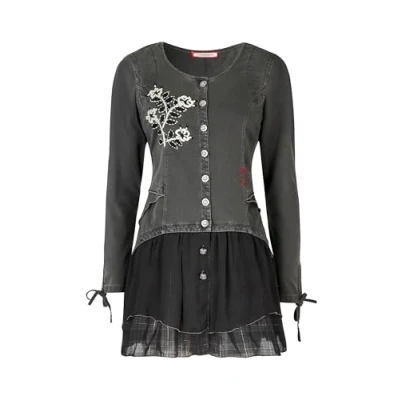 Unique tunic top Long sleeves with cuff ties Elegant floral embroidery Mix and match buttons Woven layered skirt