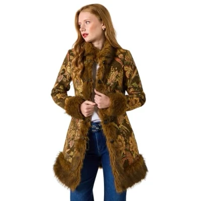 Statement jacquard coat Fully lined Large rouleau loop and button fastening Handy pockets in the side seam Elegant gold colour with a floral design
