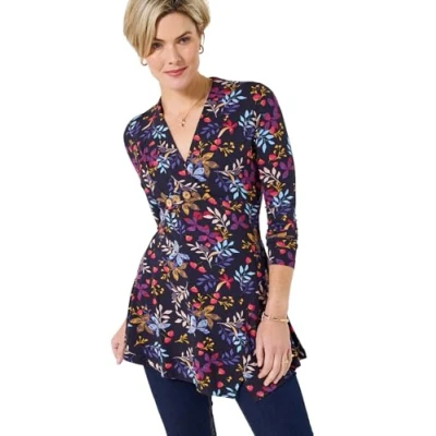 Joe Browns Women's Floral Slim Fit Asymmetric Hem Long Sleeve Tunic Top Shirt, Blue, 16