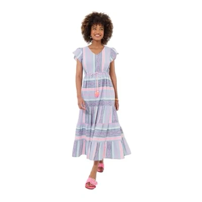 Eye-Catching Summer Style: A vibrant mix of stripes and geometric prints makes this maxi dress a must-have for bold summer fashion. Comfortable & Flattering Fit: A V-neckline, short sleeves, and a gathered waist create a breezy, figure-enhancing silhouette. Tassel Tie Detail: Add a playful touch with the charming tassel tie, perfect for bringing boho vibes to your seasonal wardrobe. Summer-inspired V-neck dress, Short sleeves, Maxi length, Contrast stripe and geo prints, Fun tassel tie