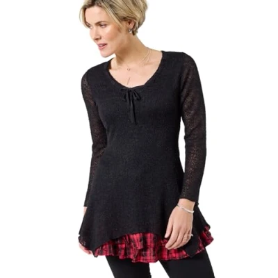 Joe Browns Women's Handkerchief Hem Flared Sleeve Tie Neck Tunic Top Shirt, Black, 16