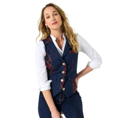 Women’s waistcoat Four buttons for fastening Handy pockets Striking check panels Blanket stitch detail