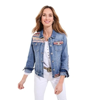 This stretch denim jacket brings a playful twist to a classic with sequin embellishments on the pockets, chest, and hem. Flattering and comfortable, it’s perfect for layering over skirts, dresses, or standout flares for a bold, stylish look. A true wardrobe staple with a modern edge, it’s a go-to piece for casual chic styling. Stretch denim jacket , Handy pockets , Embellished pockets, hem and chest , Sequin detail. Approximate Length: 57cm