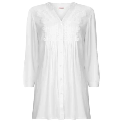 Effortless vintage charm meets everyday comfort in this longline blouse. Featuring delicate pintucks and pretty lace details, it’s perfect for adding a subtle touch of elegance to your look. Designed to flatter with its relaxed shape, it pairs beautifully with shorts, skirts, or even a layered waistcoat for a versatile summer outfit. The ultimate go-to for chic, laid-back style, it’ll keep you feeling cool and confident all season long. Longline blouse , Three-quarter sleeves , Delicate lace detail , Pretty pintucks , Button-through design. Approximate Length: 77cm