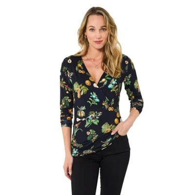 Soft jersey top Mock wrap-over neckline Long set-in sleeves with feathered shoulder seams Striking fruit print Flattering regular fit