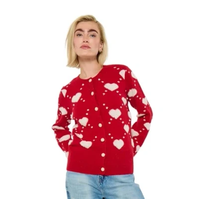 Cosy cardigan Classic crew neckline Long sleeves Red colour with white hearts Elegant pearl detail