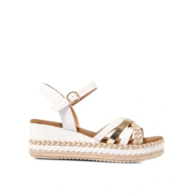 PU platform sandals with stunning gold tones and intricate crossover straps. Adorned with gold studs and braid detailing for a glamorous yet versatile look. Perfect for dressing up summer outfits, from maxi dresses to chic eveningwear. PU platform sandals, Elegant ankle strap with gold buckle, Crossover straps with standout braid detail, Pretty gold studs,
