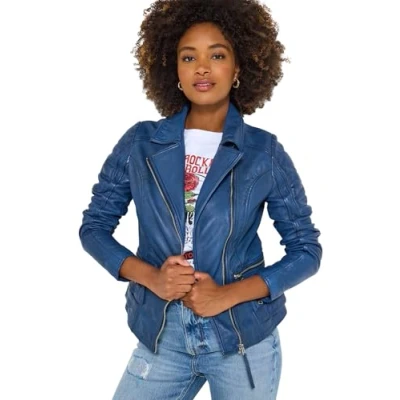 Supersoft leather biker jacket Asymmetric zip fastening Handy pockets with tassels on the zips Bold blue colour Unique adjustable buckles