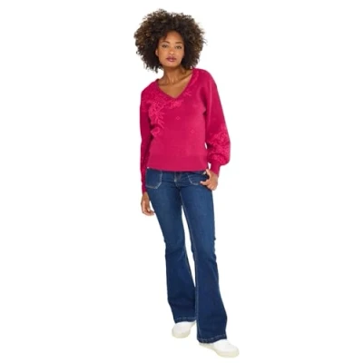 Cosy jumper Classic V neckline Long balloon sleeves Bold pink colour Beautiful paisley detail