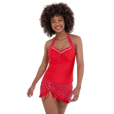 Fun and flirty: A playful yet flattering swim skirt with a bold polka dot print and retro-inspired ruched details. Comfortable and stylish: Hidden briefs provide extra coverage and support for a secure, confident fit. Perfect poolside look: Pair with a matching bikini or tankini top for a chic and coordinated ensemble.