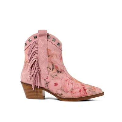 Suede ankle boots with a unique Western-inspired design featuring a floral print and silver studs. Stylish pointed toe, stacked heel, and fringe detailing for a bold, standout look. A versatile addition to your wardrobe, pairing effortlessly with skirts, dresses, and denim. Suede western ankle boots, Elegant pointed toe, Stylish stacked heel, Simple side zip fastening, Striking rose print with matt silver studs