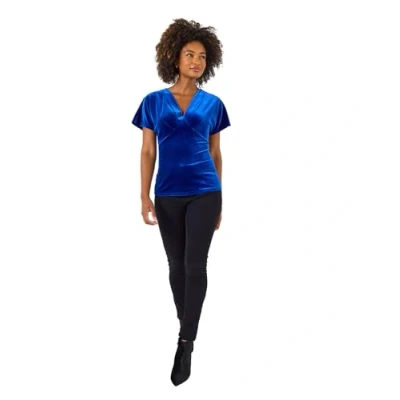 Supersoft velour top Deep V neckline Short grown-on sleeves Bold blue colour Flattering slim fit and underbust shaping