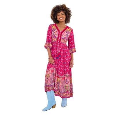 Bright, bold colors and playful tassel ties make this dress a seasonal favorite. Flattering button-through design combines style with easy-to-wear comfort. Brimming with Joe Browns’ unique boho flair, it’s a wardrobe highlight for summer. Bold V-neck dress , Three-quarter floaty sleeves , Maxi length , Beautiful boho print with lace trims , Tassel tie at the waist , Button-through design, Approximate Length: Regular: 135cm Petite: 127cm