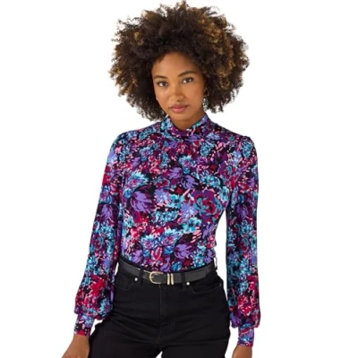 Joe Browns Women's Floral Print High Neck Jersey Top Blouse, Purple, 12