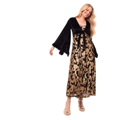 Showstopper Design: This unique dress features elegant kimono-style sleeves and a luxurious gold floral skirt, perfect for stealing the spotlight at any festive occasion. Velour Mock Wrap Cardigan: The soft and stretchy velour mock-wrap cardigan adds a layer of comfort and warmth while maintaining a stylish and sophisticated look. Luxurious Fabric: Made from high-quality velour fabric, this statement dress offers both comfort and a touch of opulence, ensuring you stay warm and glamorous throughout your event. Approximate Length: (Regular) 130cm (Petite) 122cm