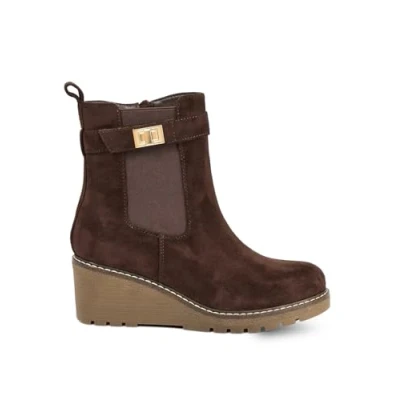 Chocolate brown microfibre ankle boots Comfortable wedge heel Simple side zip fastening Classic buckle strap detail