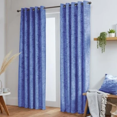 Luxury Crushed Velvet Fabric – Blue: 90'' (Width) x 72'' (Drop) (229cm x 183cm) Pair Of Eyelet Crushed Velvet curtains. Add a touch of glamour and elegance to your home with our soft, shimmering crushed velvet curtains. Fully Lined for Quality & Warmth – Each pair is fully lined to enhance the drape, reduce light, and provide extra insulation. Sold As A Pair - The Size Stated Is For Each Curtain And You Get Two In A Pack Easy to Hang Eyelet Header – Designed with sturdy eyelets to fit any standard curtain pole, ensuring quick and effortless installation. The eyelet hole diameter is 4cm and no larger than a 35mm diameter pole is recommended for use with these curtains Stylish & Versatile – Perfect for living rooms, bedrooms, and dining areas, these curtains bring depth, texture, and sophistication to any décor. Please note that crushed velvet is a reflective fabric, so the shade may appear lighter or a different shade under certain lighting.