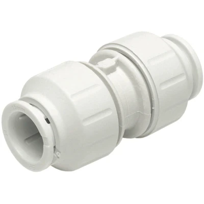 JG Speedfit equal straight connector push-fit fitting for the connection of two equal pipe sizes. Simply push the push-fit fitting fully onto the pipe and twist the plastic nut clockwise to lock in place. To demount the connection, unlock the nut by hand and push the collet towards the body of the push-fit fitting and pull the pipe to release. The JG Speedfit equal straight connector push-fit fitting is up to 40% faster to install than traditional methods and is easier to use in confined spaces by removing the need for hot works and tools. Designed, manufactured and assembled in the UK. Instant push-fit connection Install and demount in seconds without tools Safe flame-free installation, with no hot works, glue or flux Grip & Seal collet with stainless steel teeth and main O-Ring seal Twist & Lock mechanism secures fitting and adds compression Non-toxic, resists corrosion and no scale build-up Compatible with Speedfit PEX and polybutylene plastic pipe (inserts required) and copper