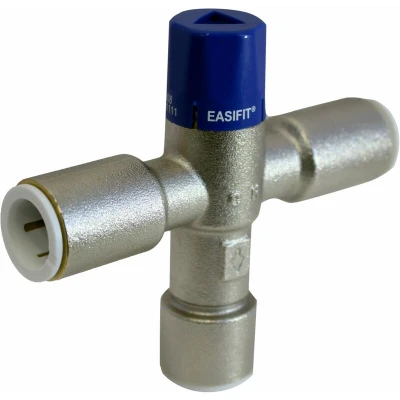 General description Reliance Valves Easifit Thermostatic Mixing Valve blends hot and cold water to ensure safe and comfortable water temperature, reducing the risk of accidental injuries and burns. Ultra-compact and lightweight, Easifit is ideal for use in tight spaces such as under basins, baths, and shower installations. Technical specifications Flow rate: as low as 1 lpm Pressure differential: works in larger areas up to 10:1 Seals: Viton seals for improved performance at higher temperatures Compatibility and accessories Flat faced unions or JG Speedfit push-fit connections Suitable for Speedfit PEX and polybutylene barrier pipe (inserts required) or copper pipe Flat faced union version can be used with copper pipe only Usage Suitable for shower, bath, basin, and bidet hot water applications Other information Complies with all applicable UK and European performance standards Includes check valves and strainers for protection Available in 2-in-1 and 4-in-1 valve configurations Can