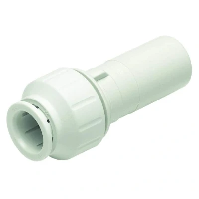 The John Guest Speedfit Fitting Reducer is ideal for connecting plastic and copper pipes. It facilitates quick attachment of two different sized Speedfit fittings to reduce line size. The push-fit connection requires no adhesives or flames, making it simple to install and remove, even in tight spaces. It is non-toxic, resistant to scale build-up and corrosion, and works with both hot and cold water systems as well as central heating. It features a grip and seal connection and is BSI and WRAS approved. This specific reducer is available in a 15mm x 10mm size, ensuring versatile application for various piping needs.. John Guest Speedfit Fitting Reducer - 15mm x 10mm Plastic