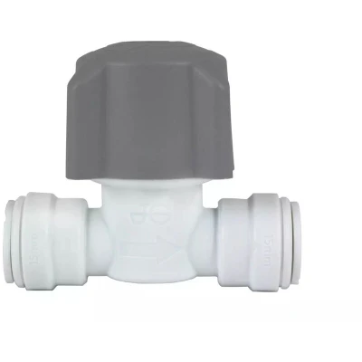 General description This John Guest Speedfit Stopcock is designed to allow users to stop the flow of water to a fixture or zone in case of emergency or repair. It features a reliable leak-proof connection through its blend of push-fit and multi-seal technology, making it a must-have for any dwelling. The valve is simple to install, requiring no tools for installation or demounting, which is particularly advantageous in tight spaces. Technical specifications Brand: JG Speedfit Material: Plastic Manufacturer ID: 15STV/2 Warranty: 50 years Diameter: 15 mm Pack Size: 1 Fitting Type: Stop Cock Minimum operating temperature: -20 °C Maximum operating temperature: 65 °C Maximum operating pressure at minimum temperature: 12 BAR Maximum operating pressure at maximum temperature: 3 BAR Suitable for hot and cold water services, NOT suitable for central heating systems BS EN 7291 parts 1, 2, 3 and S, WRAS approved Installation Simply push the fitting fully onto the pipe and twist the plastic nut